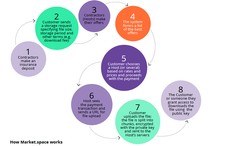 Market.space adalah sistem agregator host self-regulatory, terdesentralisasi untuk penyimpanan dan transmisi data dan distribusi konten langsung. Sistem ini berfungsi sebagai pasar di mana mekanisme pertukaran harga dan jumlah peserta yang tidak terbatas mendasari profitabilitas. Ini adalah platform yang sangat transparan dan benar-benar aman untuk fungsi seperti distribusi konten langsung. Ini menerima token dari proyek penyimpanan blockchain terkemuka seperti STORJ dan Sia Tech. Ini menawarkan platform transparan dan platform penyimpanan yang benar-benar aman. Itu tidak melibatkan peraturan, komisi atau ancaman keamanan. Kontraktor yang terlibat dalam sistem ini dibayar. Market.space membantu mengatasi keterbatasan sistem penyimpanan data modern berbasis blokir dan berbasis cloud.